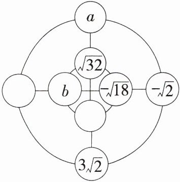 解析 设外圆空白处的数为 $x$,内圆空白处的数为 $y$,根据题意得 $a + x+3\sqrt{2}+(-\sqrt{2})=\sqrt{32}+b + y+(-\sqrt{18})$,$a+\sqrt{32}+y+3\sqrt{2}=x + b+(-\sqrt{18})+(-\sqrt{2})$,整理得 $\begin{cases}a - b+x - y=4\sqrt{2}-3\sqrt{2}-3\sqrt{2}+\sqrt{2}=-\sqrt{2}①\\a - b+y - x=-3\sqrt{2}-\sqrt{2}-4\sqrt{2}-3\sqrt{2}=-11\sqrt{2}②\end{cases}$,$① + ②$得 $2(a - b)=-12\sqrt{2}$,则 $a - b=-6\sqrt{2}$。