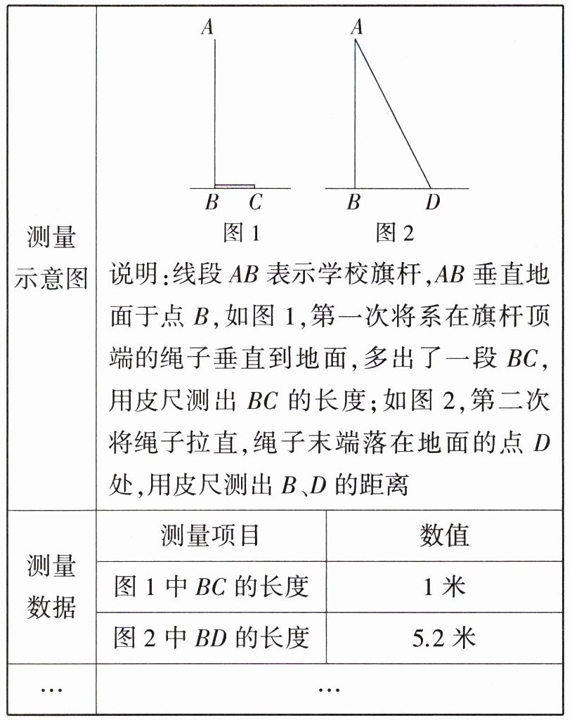 解析:\n(1)由题图 1 可得绳子的长度比旗杆的高度多 $1$ 米,设旗杆 $AB$ 的高度为 $x$ 米,则绳子的长度为 $(x + 1)$ 米,由题图 2 可得,在 $Rt\triangle ABD$ 中,$AB^{2}+BD^{2}=AD^{2}$,$\therefore x^{2}+5.2^{2}=(x + 1)^{2}$,解得 $x = 13.02$。答:旗杆 $AB$ 的高度为 $13.02$ 米。\n(2)旗杆的高度。(答案不唯一,合理即可)