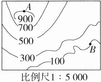 答案:810 解析:如图,从地形及其等高线可以抽象出一个 $Rt\triangle AOB$,由等高线的概念,可知 $AO = 900 - 100 = 800(m)$,结合比例尺的知识可以得到 $OB = 2.5\times5000 = 12500\ cm = 125\ m$,$\therefore A$、$B$ 两个地点之间的实际直线距离 $AB=\sqrt{800^{2}+125^{2}}\approx810(m)$。