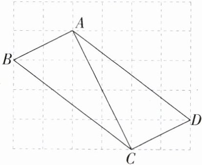 解析:\n(1)$AC=\sqrt{2^{2}+4^{2}}=2\sqrt{5}$;$CD=\sqrt{1^{2}+2^{2}}=\sqrt{5}$;$AD=\sqrt{3^{2}+4^{2}} = 5$。\n(2)由(1)知 $AC^{2}=20$,$CD^{2}=5$,$AD^{2}=25$,所以 $AC^{2}+CD^{2}=AD^{2}$,所以 $\triangle ACD$ 是直角三角形。