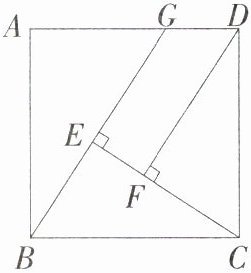 证明:因为四边形ABCD是正方形,所以BC = CD,∠BCD = 90°,因为CE⊥BG,DF⊥CE,所以∠BEC = ∠DFC = 90°,所以∠BCE + ∠CBE = 90° = ∠BCE + ∠DCF,所以∠CBE = ∠DCF,在△CBE和△DCF中,{∠BEC = ∠CFD,∠EBC = ∠FCD,BC = CD},所以△CBE≌△DCF(AAS),所以CF = BE,CE = DF,因为CE = CF + EF,所以DF = BE + EF。