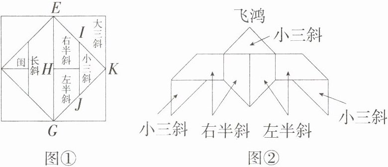 5. 情境题·数学文化 如图①,《蝶几图》是以正方形为模分割为长斜(等腰梯形),右半斜和左半斜(直角梯形),小三斜,大三斜和闺(均为等腰直角三角形),I、J分别为EK、GK的中点. 现取右半斜两张,左半斜两张和小三斜三张,拼成图②所示的“飞鸿”,若图①中大正方形的边长为4,则“飞鸿”的高度为________.(M8218007)