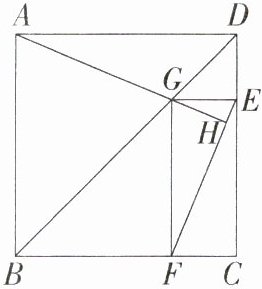 解析: (1)证明:因为四边形ABCD是正方形,所以AD⊥CD,因为GE⊥CD,所以AD//GE,所以∠DAG = ∠EGH。 (2)AH⊥EF。理由如下:连接GC交EF于点O,如图,因为BD为正方形ABCD的对角线,所以∠ADG = ∠CDG = 45°,因为DG = DG,AD = CD,所以△ADG≌△CDG(SAS),所以∠DAG = ∠DCG。在正方形ABCD中,∠ECF = 90°,因为GE⊥CD,GF⊥BC,所以四边形FCEG为矩形,所以OE = OC,所以∠OEC = ∠OCE,所以∠DAG = ∠OEC,由(1)得∠DAG = ∠EGH,所以∠EGH = ∠OEC,所以∠EGH + ∠GEH = ∠OEC + ∠GEH = ∠GEC = 90°,所以∠GHE = 90°,所以AH⊥EF。
