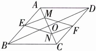 解析:(1)证明:因为四边形 $ABCD$ 是平行四边形,所以 $AB// CD$,$AB = CD$,所以 $\angle EAM=\angle FCN$。因为点 $E$,$F$ 分别是 $AB$,$CD$ 的中点,$AB = CD$,所以 $AE = CF$。因为 $AM = CN$,所以 $\triangle AEM\cong\triangle CFN(SAS)$,所以 $EM = FN$,$\angle AME=\angle CNF$,所以 $\angle EMN=\angle FNM$,所以 $EM// FN$。因为 $EM = FN$,所以四边形 $MENF$ 是平行四边形。(2)因为四边形 $ABCD$ 是平行四边形,所以 $OA = OC$,$OB = OD$。因为 $BD = 8$,所以 $OB = 4$。因为 $AM = CN$,$OA = OC$,所以 $OM = ON$。因为 $AM + CN = MN$,所以 $AM = OM = ON = CN$。因为点 $E$ 为 $AB$ 的中点,所以 $EM$ 为 $\triangle ABO$ 的中位线,所以 $EM=\frac{1}{2}OB = 2$。