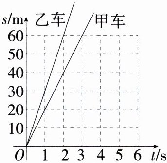 (2)根据题图可得,乙车的行驶速度为$60\div2 = 30(m/s)$,甲车的行驶速度为$40\div2 = 20(m/s)$,时间每增加1 s,甲、乙两车之间的距离增加$30 - 20 = 10(m)$,所以甲、乙两车之间的距离$y(m)$关于行驶时间$t(s)$的解析式为$y = 10t$。