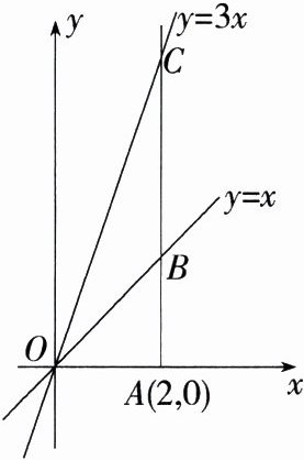 18.一题多解 (2023江西南昌二十八中期末,10,★★☆)如图所示,已知正比例函数$y = x$和$y = 3x$,过点$A(2,0)$作x轴的垂线,与这两个正比例函数的图象分别交于B,C两点,则$\triangle OBC$的面积为__________(其中O为坐标原点).(M8219002)