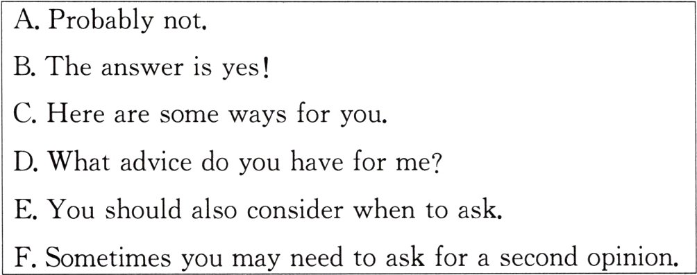 5. F 【点拨】通读最后一段可知,本段讲的是如果第一个人的建议解决不了问题,你可以询问另一个人的建议。故选项 F“有时你可能需要征求其他意见”符合语境。