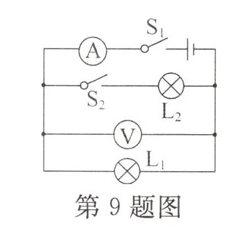 9.将两个规格不同的灯泡 $L_1$、$L_2$ 接入如图所示的电路中,电源电压保持不变,闭合开关 $S_1$、$S_2$ 后,下列说法正确的是 ( )