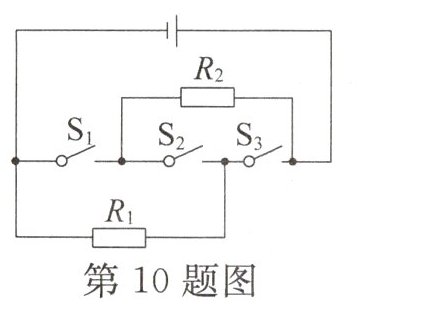 10.如图所示的电路中,电源电压 $U = 10\ V$,电阻 $R_1 = 5\ \Omega$,$R_2 = 20\ \Omega$。只闭合开关 $S_1$ 时,电路中的工作电流是______ A;只闭合开关 $S_2$ 时,电路消耗的功率为 $P$,只闭合开关 $S_1$ 和 $S_3$ 时,$R_1$ 与 $R_2$ ______ 联,电路消耗的功率为 $P'$,则两次功率之比 $P : P' =$ _______ 。