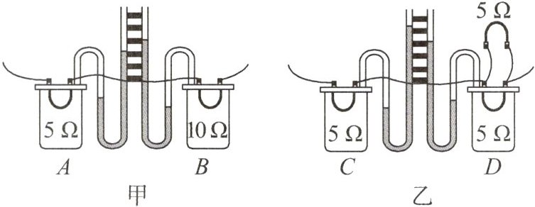 (4)图乙中D容器外并联了一个5 Ω的电阻丝,它的作用是使两个容器中的_______不同。图乙探究的是电流通过电阻丝产生的热量与________的关系。通过对比观察可知,______(选填“C”或“D”)容器中电阻丝产生的热量多。由此可得出结论:______________________________。