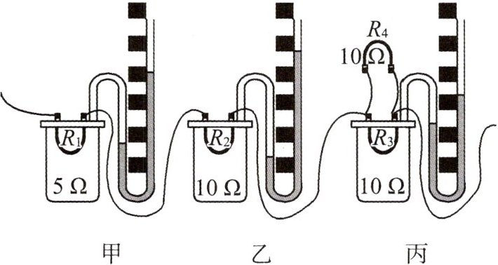 (2)观察甲、丙两部分的实验装置,会发现电阻______(选填“$R_{1}$”或“$R_{3}$”)产生的热量更多,由这一现象可知,_______(选填“电流”或“电阻”)对导体产生的热量的影响更大。