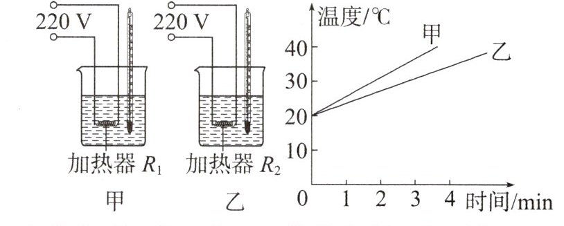 8.如图所示,甲、乙两个相同的烧杯中装有等质量的水,分别放入加热器$R_{1}$和加热器$R_{2}$进行加热,不计热量损失,得到了温度随时间变化的关系图像,下列说法正确的是 ( )