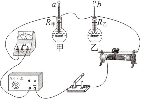 9.(教材素材变式)小明在冬天取暖时发现:电暖器的电热丝热得发红,而与电热丝相连的导线却不怎么热。下图是小明进行实验探究的部分电路,甲、乙两个完全相同的烧瓶内有阻值分别为$R_{甲}$、$R_{乙}$的电阻丝,$R_{甲}>R_{乙}$,瓶中插入温度计$a$、$b$。