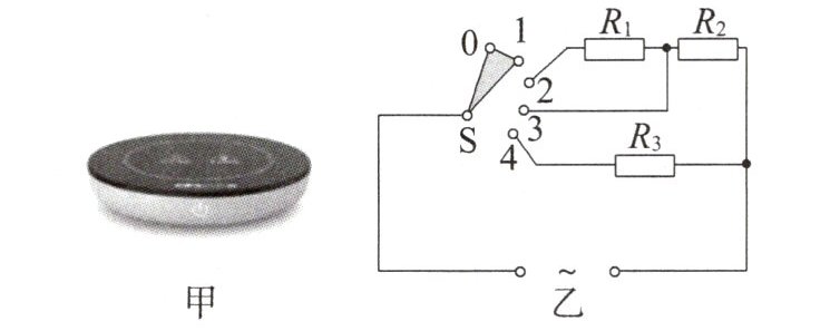 6.一款$55^{\circ}C$暖暖杯的保温垫如图甲所示,其内部电路如图乙所示,S 为旋转型开关(每次和两个触点接通),通过旋转开关 S,可实现舒适、温暖、加热的挡位切换。保温垫的参数见表格。