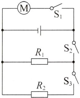 4.(2023·广西中考)简易榨汁杯的电路原理图如图所示,榨汁杯工作时有榨汁、加热、保温三个挡位。当闭合开关________时,榨汁杯处于榨汁挡;当只闭合开关$S_{2}$时,榨汁杯处于________挡。