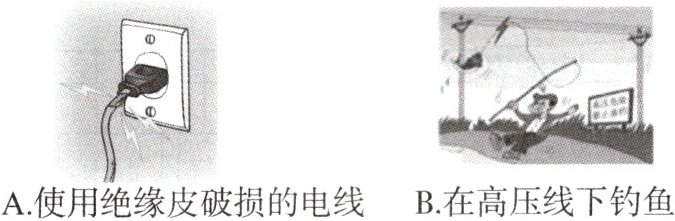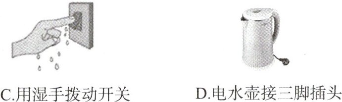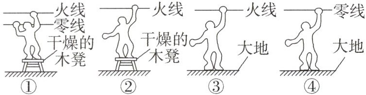 2. 家庭电路中,发生触电事故都是人体直接或间接跟______线接触造成的。在家庭电路中,火线和零线(大地)整体上相当于电源,电压为220 V,远超人体安全电压的上限______ V。所以,当人体连接在家庭电路中,成为其中的“一部分导体”时,就会发生触电事故。如图所示的情况中,会发生触电事故的是________。