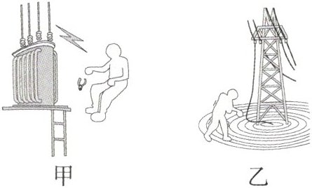3.(教材素材变式)导体和绝缘体没有明确的界限,根据欧姆定律$I = \frac{U}{R}$,虽然通常情况下人体的电阻约为$10^{4} ~ 10^{5} \Omega$,但是当电压很大时,通过人体的电流$I$会比较______(选填“小”或“大”)。如图甲所示,当人体靠近高压电源时,电流会“击穿”人体附近的空气,造成人体__________触电。如图乙所示,高压线落地后,当人经过这个区域时,两只脚与高压线落地点的距离不同,两脚之间存在高电压,电流从一条腿流入,另一条腿流出,从而造成__________触电。