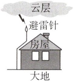 6. 雷电是大气中一种剧烈的________现象。高大建筑的顶端都有避雷针,通过很粗的金属线与大地相连,如图所示。由于避雷针的导电性能比房屋好,当雷电产生时,避雷针几乎把房屋________,从而导致几乎没有电流经过房屋。