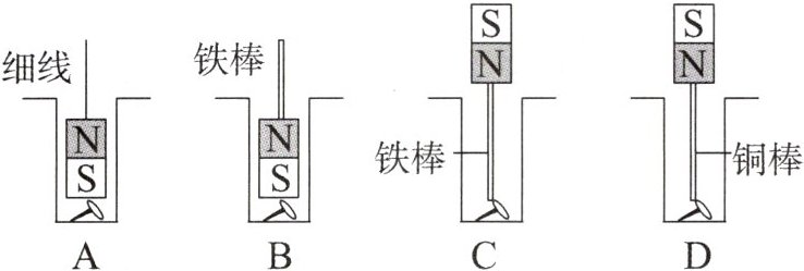 5.如图所示,在一次课外实验活动中,一颗铁质的小螺丝掉入细小狭长的小洞中。小科设计了以下四种方案,其中不能取出小螺丝的是 ( )
