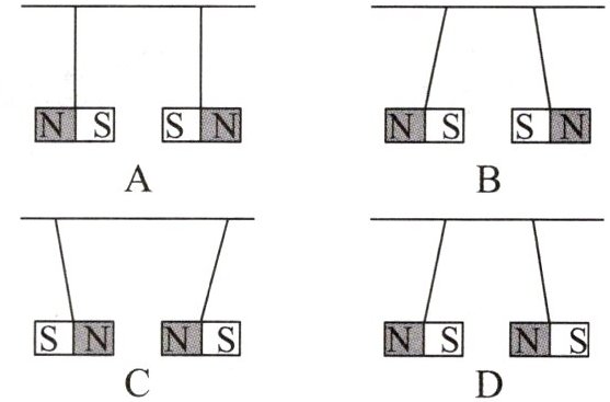 [变式] 有两根大头针被磁体的一端吸引,悬在磁体下方,如图所示的四幅图能正确反映实际情况的有_________。