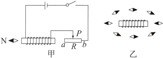(2)图乙是通电螺线管周围有机玻璃板上小磁针的分布状态,观察可知通电螺线管的外部磁场与___________的磁场相似,推测通电螺线管的两极在通电螺线管的________。这里用到的物理方法是___________法。