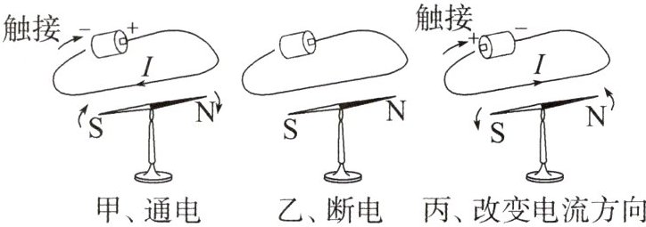 (1)对比甲、乙两图发现:导线通电时,小磁针发生偏转;切断电流时,小磁针又回到原位。这说明通电导线周围存在_______,通电导线相当于_______。