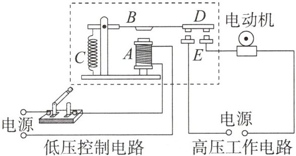 (2)当低压控制电路断开时,电磁铁A________(选填“具有”或“失去”)磁性,衔铁B在左侧弹簧C的作用下返回原位,动触点D与静触点E分离,高压工作电路________(选填“闭合”或“断开”)。
