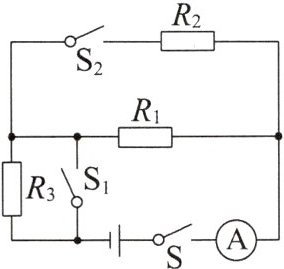 17. 如图所示,电源电压不变,定值电阻$R_{1}$、$R_{2}$、$R_{3}$的阻值分别为5 $\Omega$、10 $\Omega$、20 $\Omega$。①只闭合开关S时,电路总功率为$P_{1}$;②闭合开关S、$S_{1}$时,电路总功率为$P_{2}$;③闭合开关S、$S_{1}$、$S_{2}$时,电路总功率为$P_{3}$。$P_{1}$、$P_{2}$、$P_{3}$的大小关系为 ( )