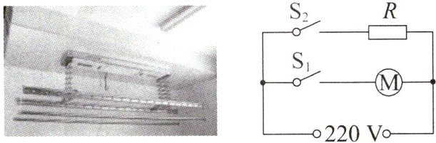 14. 某款有冷风风干和热风烘干功能的晾衣机及其电路图如图所示,电源电压为220 V,其中R是发热电阻。当开关$S_{1}$闭合、$S_{2}$断开时,晾衣机开启风干功能,通过电动机的电流为0.2 A;当开关$S_{1}$、$S_{2}$均闭合时,晾衣机开启烘干功能,通过电阻R的电流为1 A。使用烘干功能时,电路中的总电流为______A;电路中的总功率为______W;使用烘干功能2 h,消耗______度电。
