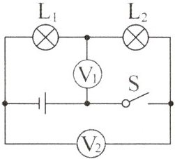 12. 如图所示,电源电压保持不变,开关S闭合后,灯$L_{1}$、$L_{2}$都能正常工作,电压表$V_{1}$、$V_{2}$的示数之比是2∶5,则$L_{1}$、$L_{2}$两灯的功率之比为 ( )