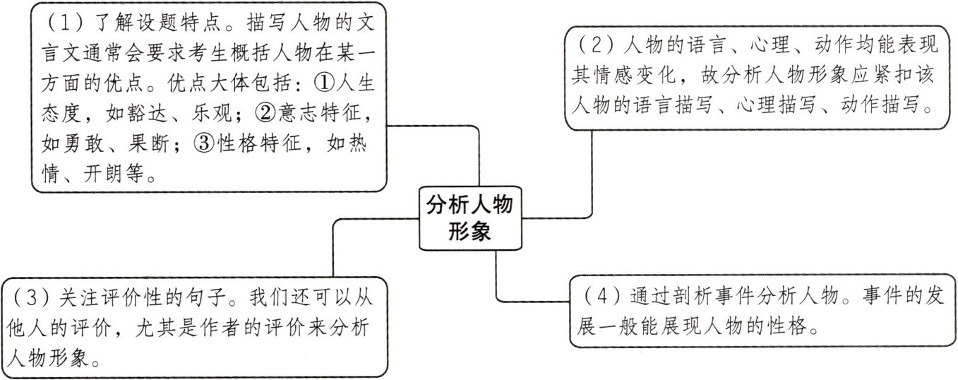 (1)了解设题特点。描写人物的文言文通常会要求考生概括人物在某一方面的优点。优点大体包括:①人生态度,如豁达、乐观;②意志特征,如勇敢、果断;③性格特征,如热情、开朗等。