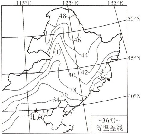 新特色·常考地图 读我国部分地区气温年较差分布图,完成3—4题。