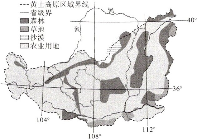 跨历史·土地制度 明朝时期,黄土高原地区驻军实行“三分守城,七分屯种”制度,随着屯田制度的实行,大量土地被开垦,导致黄土高原的侵蚀沟谷数量急剧增多。读明朝时期黄土高原土地利用图,完成 1—2 题。