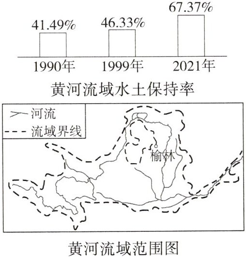 1952 年以来,陕西省榆林市韭园沟开展了持续七十年的水土保持工作,为治水治沙探索破解之道。下图为黄河流域水土保持率、黄河流域范围及韭园沟水土流失治理示意图。读图完成 7—8 题。