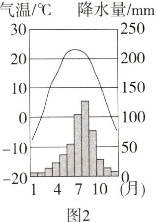延安曾经是黄河流域水土流失最严重的地区之一。近年来,延安通过“治沟造地”生态修复工程,解决了耕地不足和生态环境修复的难题。图 1 为延安位置及“治沟造地”景观图,图 2 为延安气候资料图,据此完成 3—4 题。