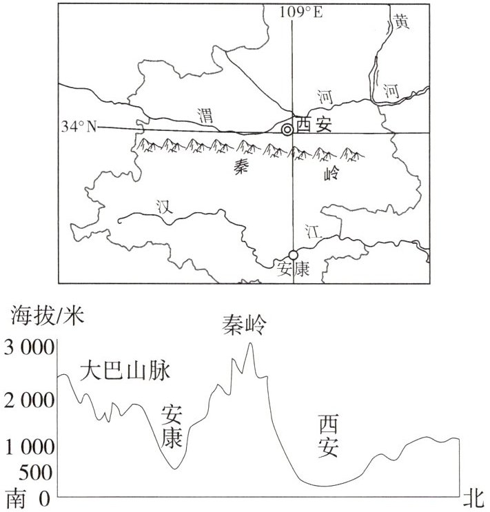 秦岭位于北纬32°~34°之间,东西绵延400~500千米,介于关中平原和南侧的汉江谷地之间,是嘉陵江、洛河、渭河、汉江四条河流的分水岭。读陕西省局部区域图和该省沿109°E经线所作地形剖面图,完成16—18题。