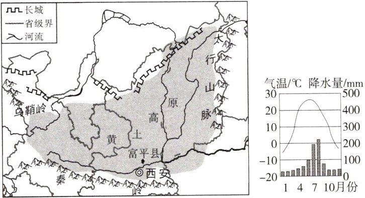 材料一 富平县位于陕西省中部,地处平原和高原的过渡地带,隶属于渭南市。下图为富平县位置示意图与当地气候资料图。