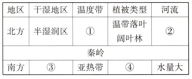 (1)秦岭之“阻”,划分南北。秦岭是我国重要的地理分界线,完成下列表格。