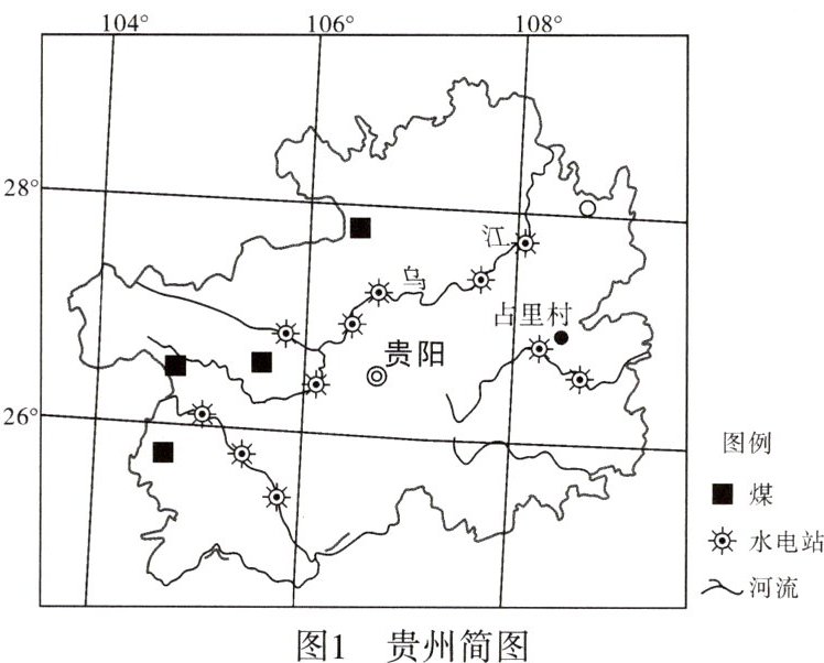云贵高原;水稻。@@滑坡、泥石流等。@@贵阳;贵或黔。@@旅游业;当地景色优美,侗族风情富有特色,旅游资源独特。@@立冬时节光照较弱,气温较低,晾晒需要时间较长;占里村地势起伏大,平地少。