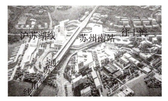 16.区域认知 (2024江苏苏州中考改编)轨道上的长江三角洲 长江三角洲地区高速化的交通网络让城市之间越来越“近”。2024年,该地区高铁建设继续高歌猛进,施工中的“沪苏湖(湖州)线”和“通苏嘉甬(宁波)线”两条高铁线交会于苏州吴江区,这里的高铁苏州南站将于年底投入使用。日益完善的路网推进了长江三角洲地区的高质量发展。读长江三角洲地区部分高速铁路分布示意图和高铁苏州南站效果图,据此回答下列问题。