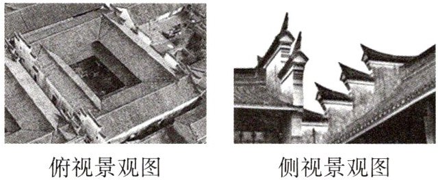 如图表示我国某地传统民居,该民居以长方形天井为核心,四面或左右后三面围以楼房,阳光射入较少,各屋都向天井排水,外围耸起马头墙,墙头高出屋顶,呈阶梯状,白墙黛瓦,明朗而素雅,读图完成14—15题。