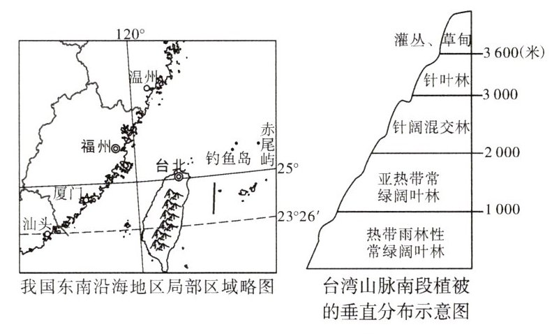 11.区域认知 (2024江苏泰州姜堰四校月考)读我国东南沿海地区局部区域略图和台湾山脉南段植被的垂直分布示意图,回答下列问题。
