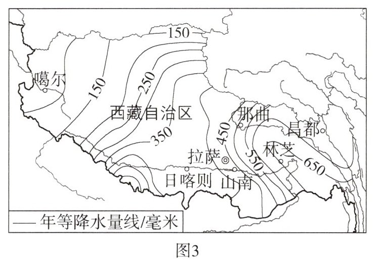 16.人地协调观 (2022山东济南中考)我国疆域辽阔,各地地理环境差异很大,即使在同一区域,也存在着明显的差异。图1为狮泉河流域图,图2为阿里与西藏其他地区平均海拔比较图,图3为西藏自治区年降水量分布示意图。结合图文资料,完成下列要求。