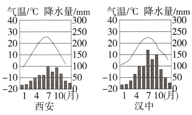 (1)汉中位于______(山脉)以南,受冬季风影响较小,______________(气候类型)气温偏高,油菜花盛开时间较早。(4 分)