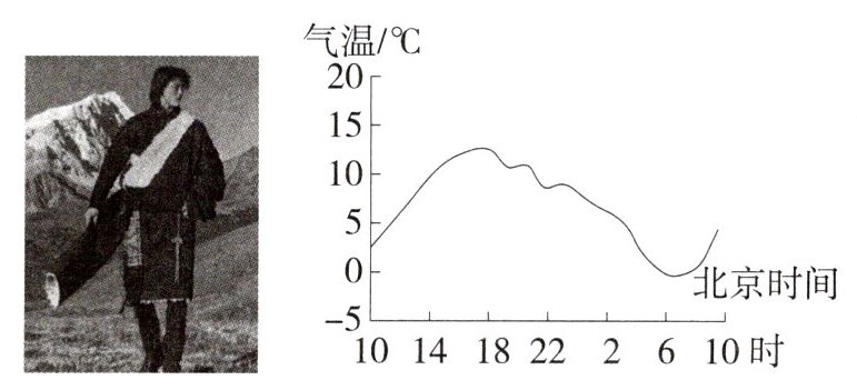 材料一 我国传统藏袍多用牦牛和藏羊的皮毛为原料制作而成,特点是长袖、宽腰、大襟。穿法独特,白天气温高时,将长袖褪去系于腰间。夜晚,宽腰肥大的衣服还可以当被盖,保温。下图为藏袍服饰图和当地某日气温变化图。