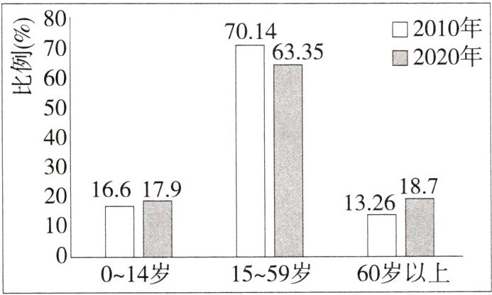 跨数学·数据统计 人口年龄结构是指少儿(0~14岁)人口、劳动力(15~59岁)人口和老年(60岁以上)人口的比重情况。读我国2010年和2020年人口年龄结构示意图,完成4—5题。