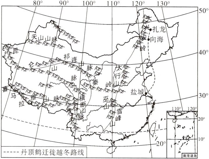(2)丹顶鹤迁徙越冬路线主要位于我国地势的第____级阶梯,该区域受海洋气流影响较____(填“大”或“小”),年降水量较____(填“多”或“少”)。