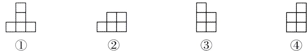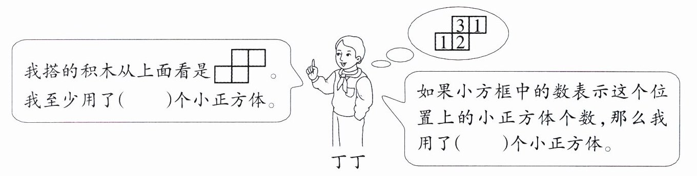 想一想,丁丁搭的这组积木,从前面看是( ),从左面看是( )。