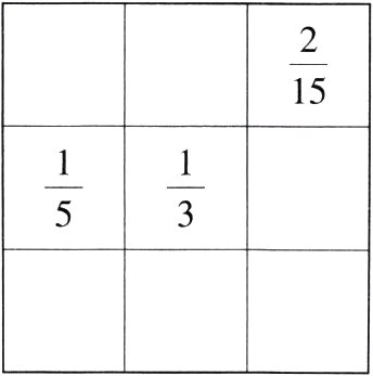 在下面的空格里填上适当的分数,使每一横行、竖列、斜线上的三个分数相加都等于1。