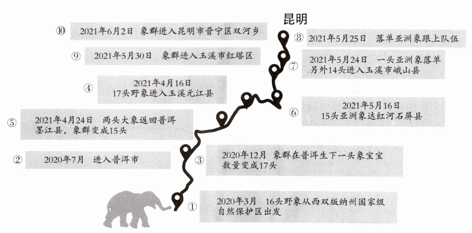 2021 年 4 月,17 头野生亚洲象“断鼻家族”迁徙被大量报道而引起关注。上图是根据航拍路线绘制的“断鼻家族”迁徙示意图。